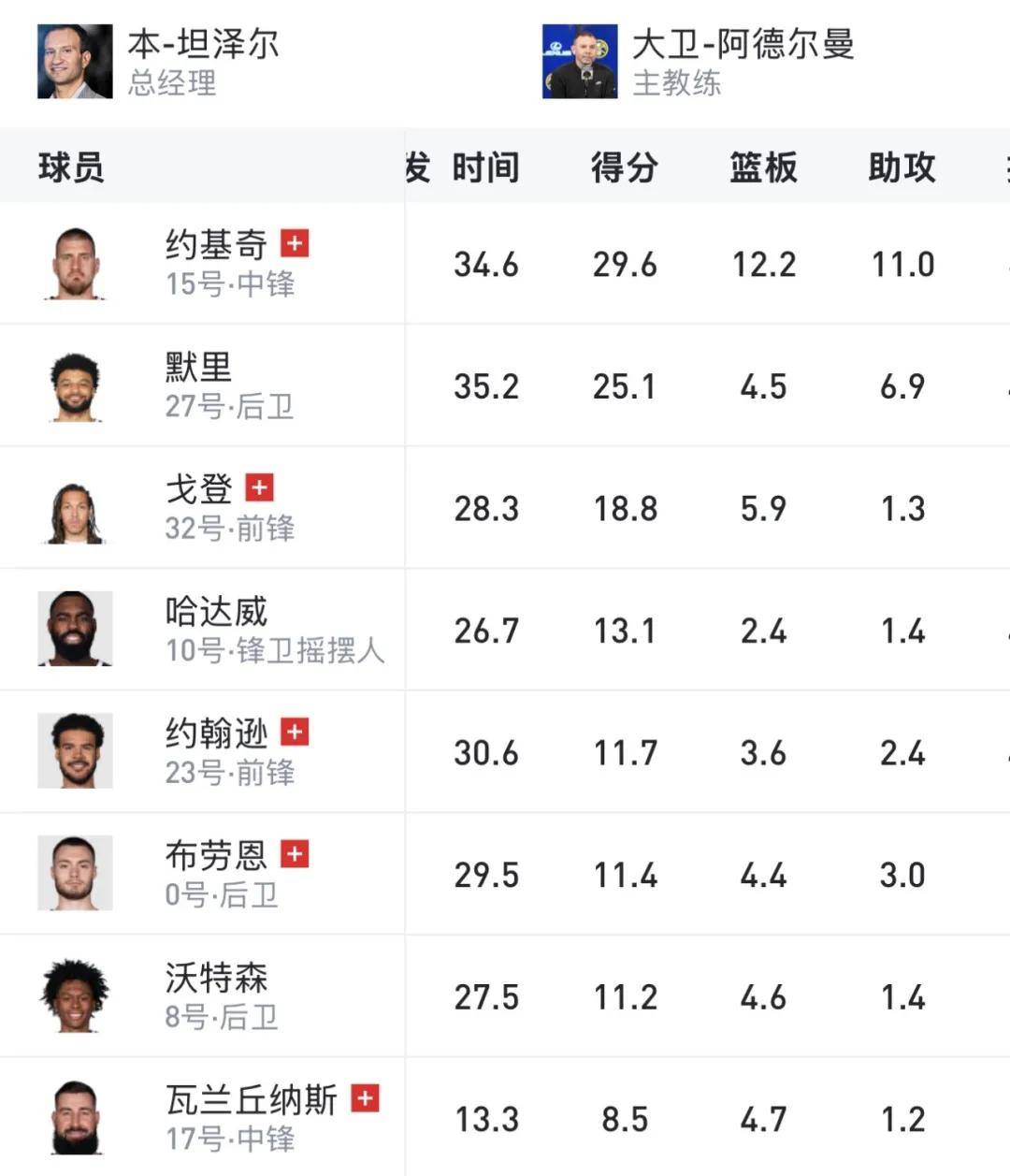 掘金到底有多惨?来看看五个伤员场均得分:约基奇(左膝过度伸展)场均29.6分,戈登(右腿筋拉伤)场均18.8分,卡梅伦-约翰逊(右膝挫伤)场均11.7分,布劳恩(左脚踝严重扭伤)11.4分,瓦兰(小腿受伤)8.5分。