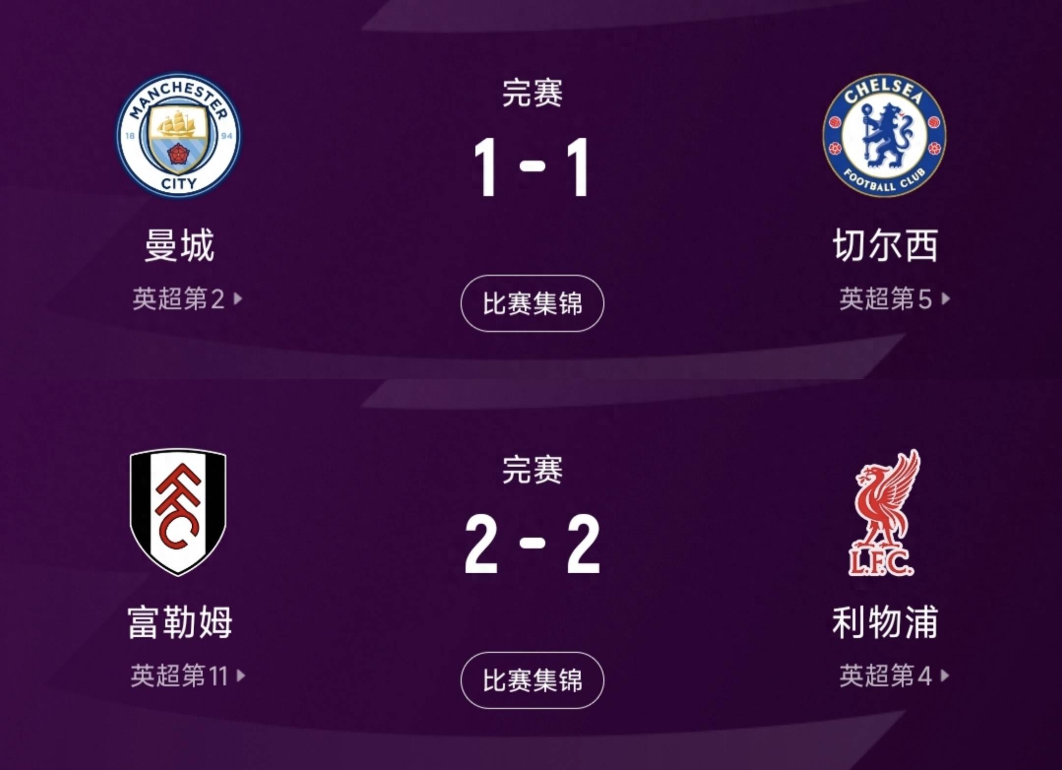 曼城主场对阵切尔西,赖因德斯上半场的进球本该让蓝月亮拿下3分,结果恩佐在第94分钟用一脚精准射门完成绝平;另一边利物浦更戏剧性,加克波94分钟的绝杀刚让红军球迷狂欢,富勒姆的里德就在97分钟轰出世界波反绝平,2-2的比分让两队都只能接受平局。