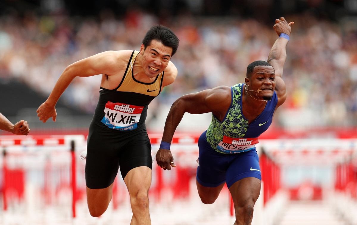 中国的谢文俊在2019年7月21日在英国伦敦举行的牙买加男子奥马尔麦克劳德排名第三的情况下赢得了男子110m栏比赛的...